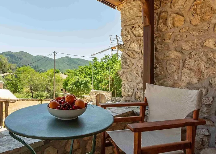 Dimossari Waterfalls Sourceまで運転して10分の所にあるPontzos - Traditional Stonehouse In The Heart Of Lefkadaは山の景色があります. 冷蔵庫,オ-ブン とガラス製品付き器具でいっぱいの台所のあるヴィラです.
